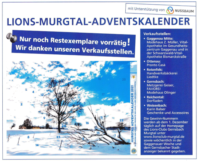 | 07.12.2024 | Murgtal-Apotheke Helfried Adami | Gutschein | 50 | € | 2561 |